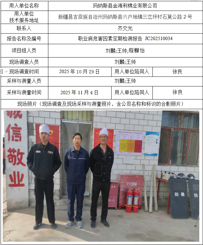 玛纳斯县金海利棉业有限公司职业病危害因素定期检测