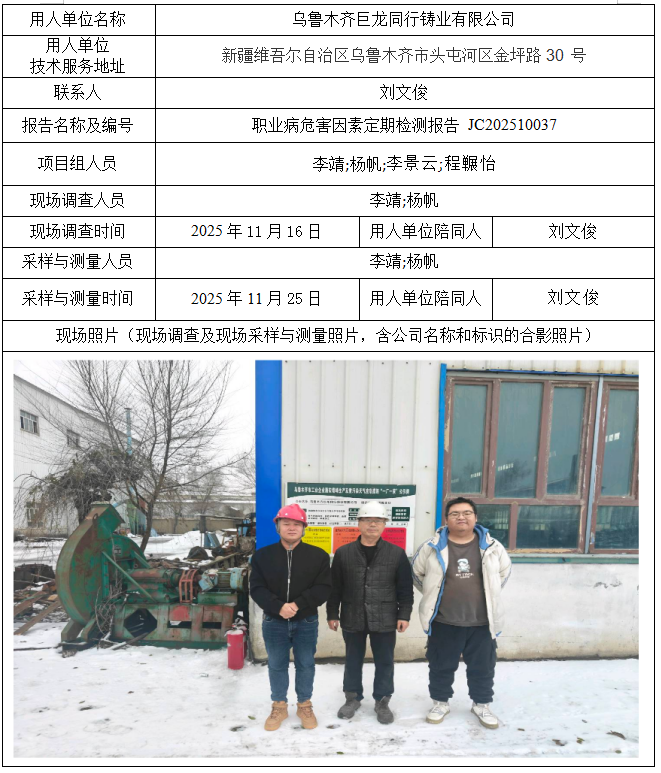 乌鲁木齐巨龙同行铸业有限公司职业病危害因素定期检测