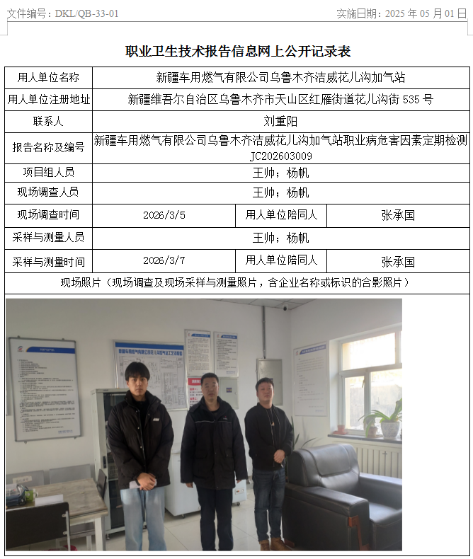 新疆车用燃气有限公司乌鲁木齐洁威花儿沟加气站职业病危害因素定期检测