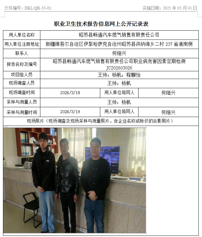 昭苏县畅通汽车燃气销售有限责任公司职业病危害因素定期检测