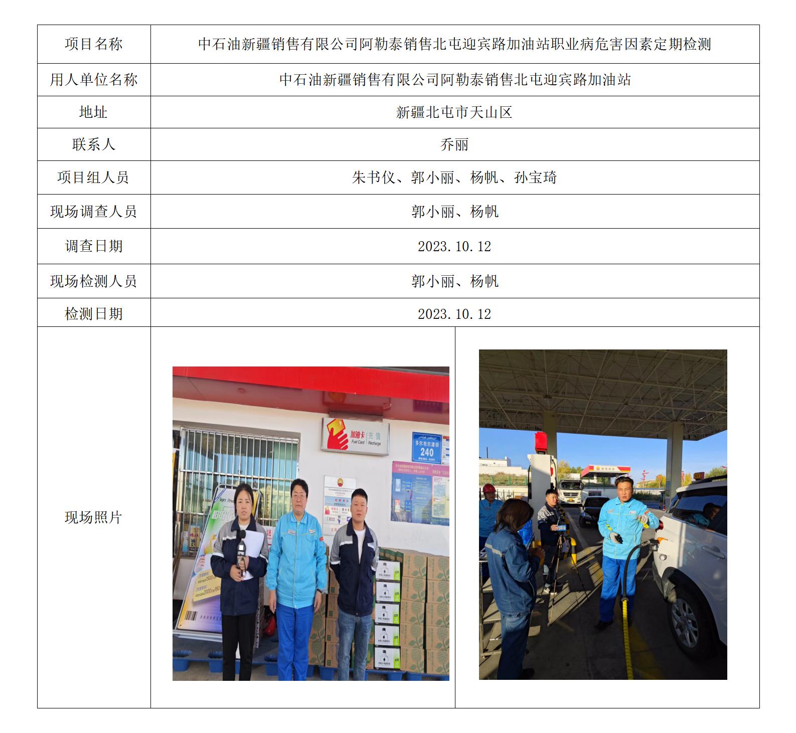 中石油新疆销售有限公司阿勒泰销售北屯迎宾路加油站职业病危害因素定期检测