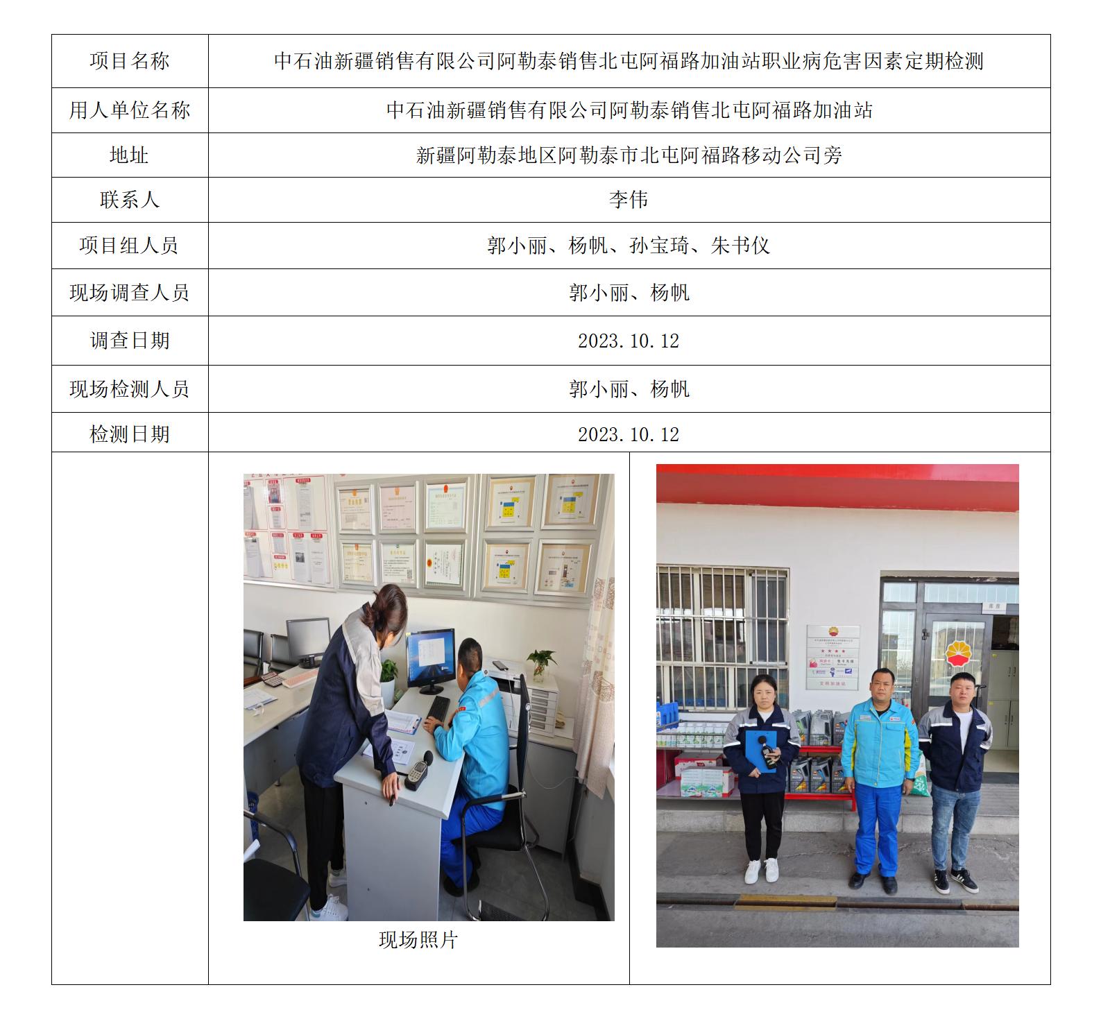 中石油新疆销售有限公司阿勒泰销售北屯阿福路加油站职业病危害因素定期检测