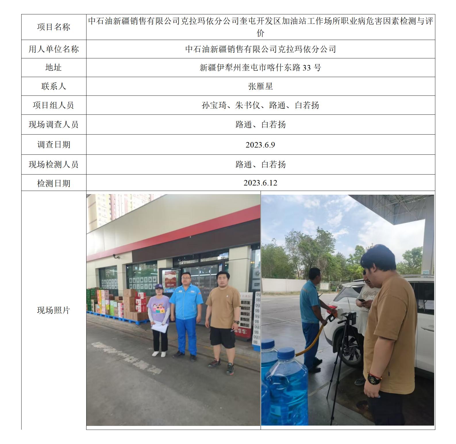 中石油新疆销售有限公司克拉玛依分公司奎屯开发区加油站工作场所职业病危害因素检测与评价 2023-07-21 16:50:39