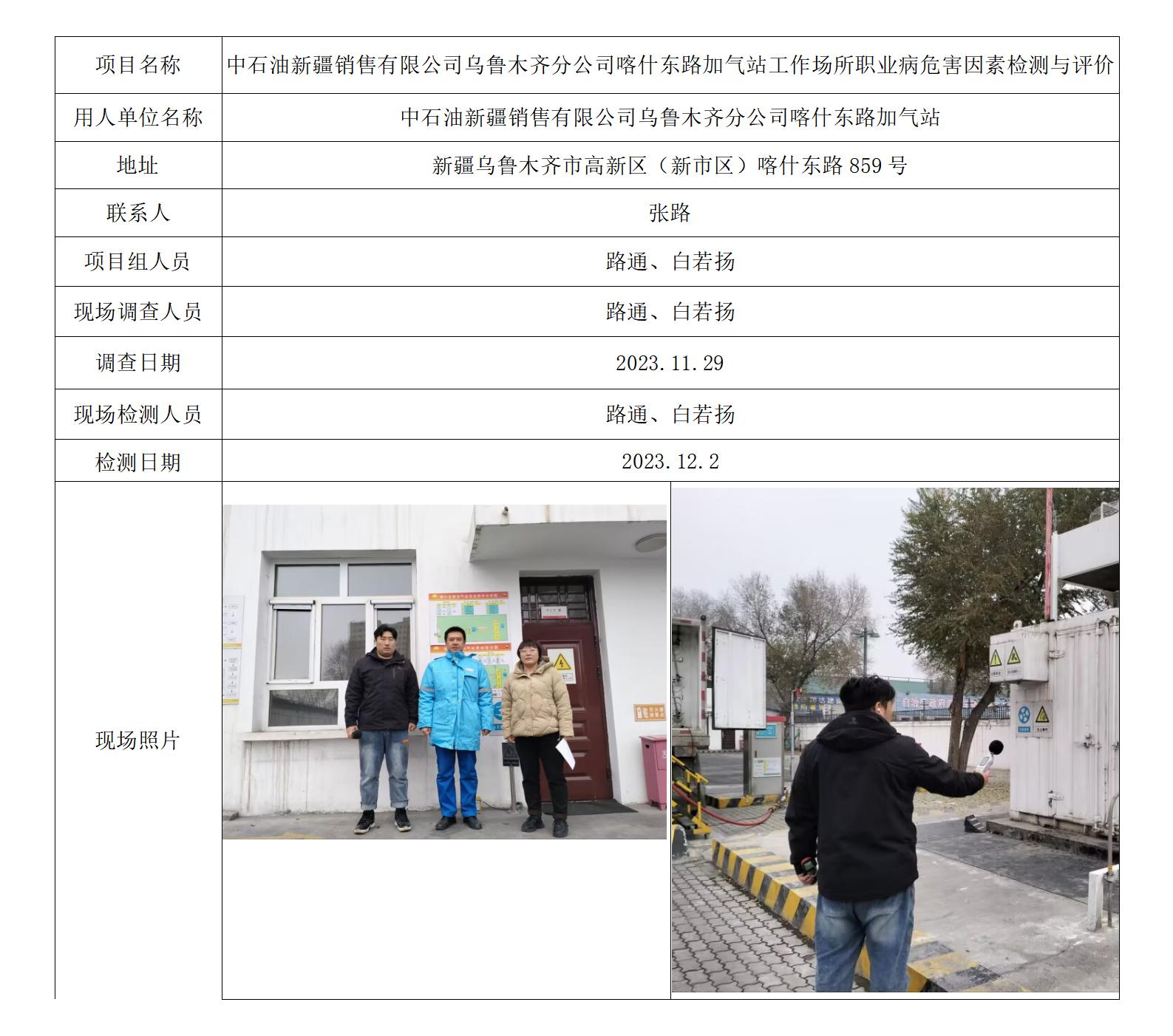 中石油新疆销售有限公司乌鲁木齐分公司喀什东路加气站工作场所职业病危害因素检测与评价