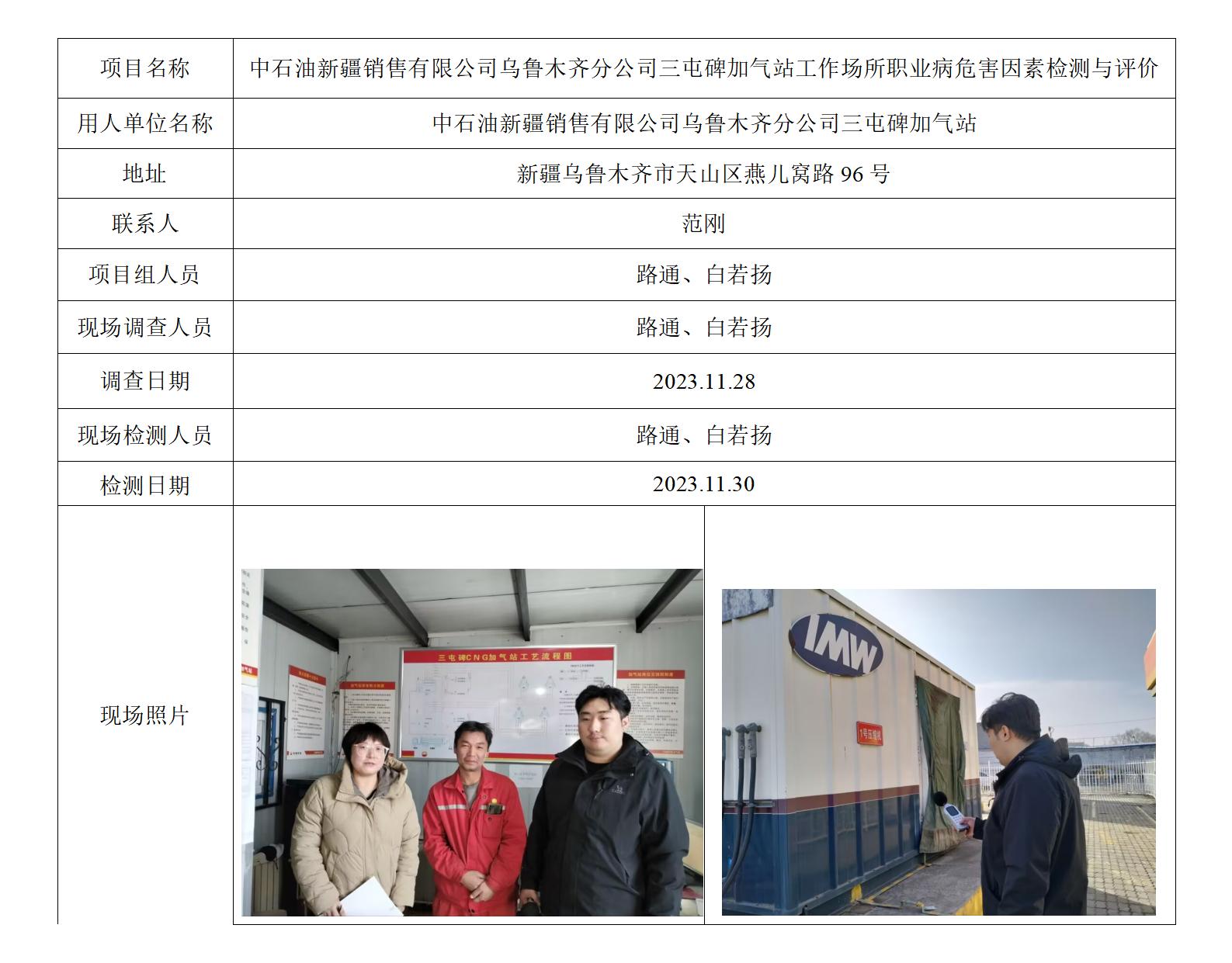 中石油新疆销售有限公司乌鲁木齐分公司三屯碑加气站工作场所职业病危害因素检测与评价