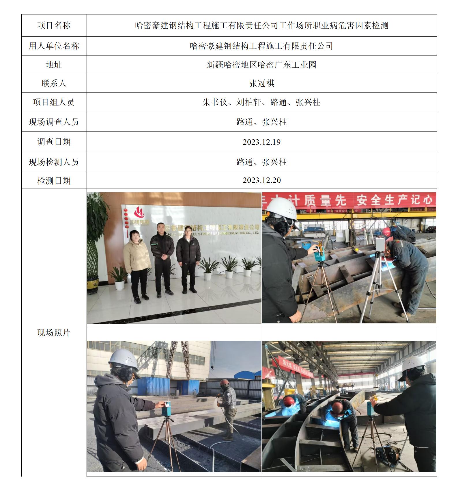 哈密豪建钢结构工程施工有限责任公司工作场所职业病危害因素检测