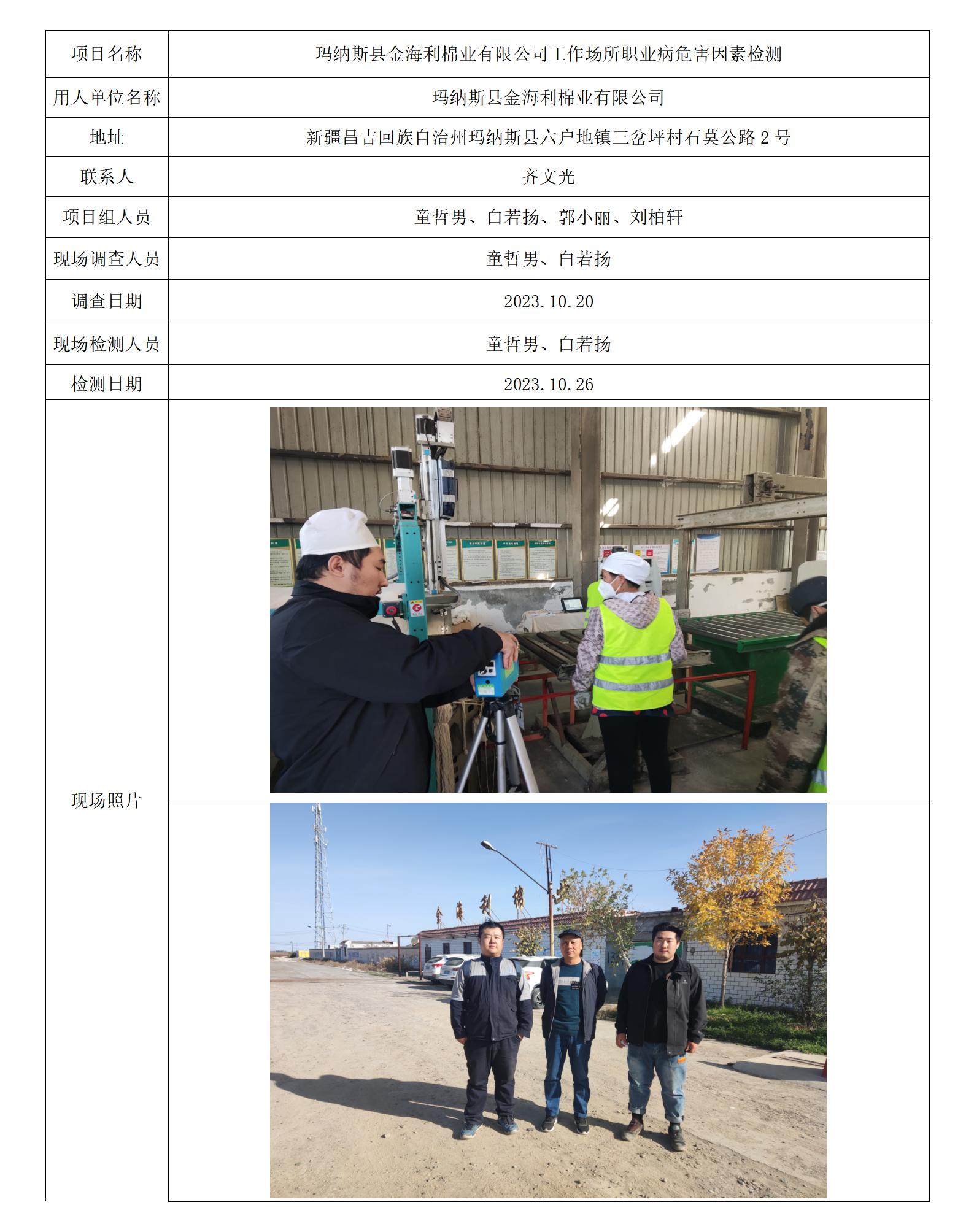 玛纳斯县金海利棉业有限公司工作场所职业病危害因素检测