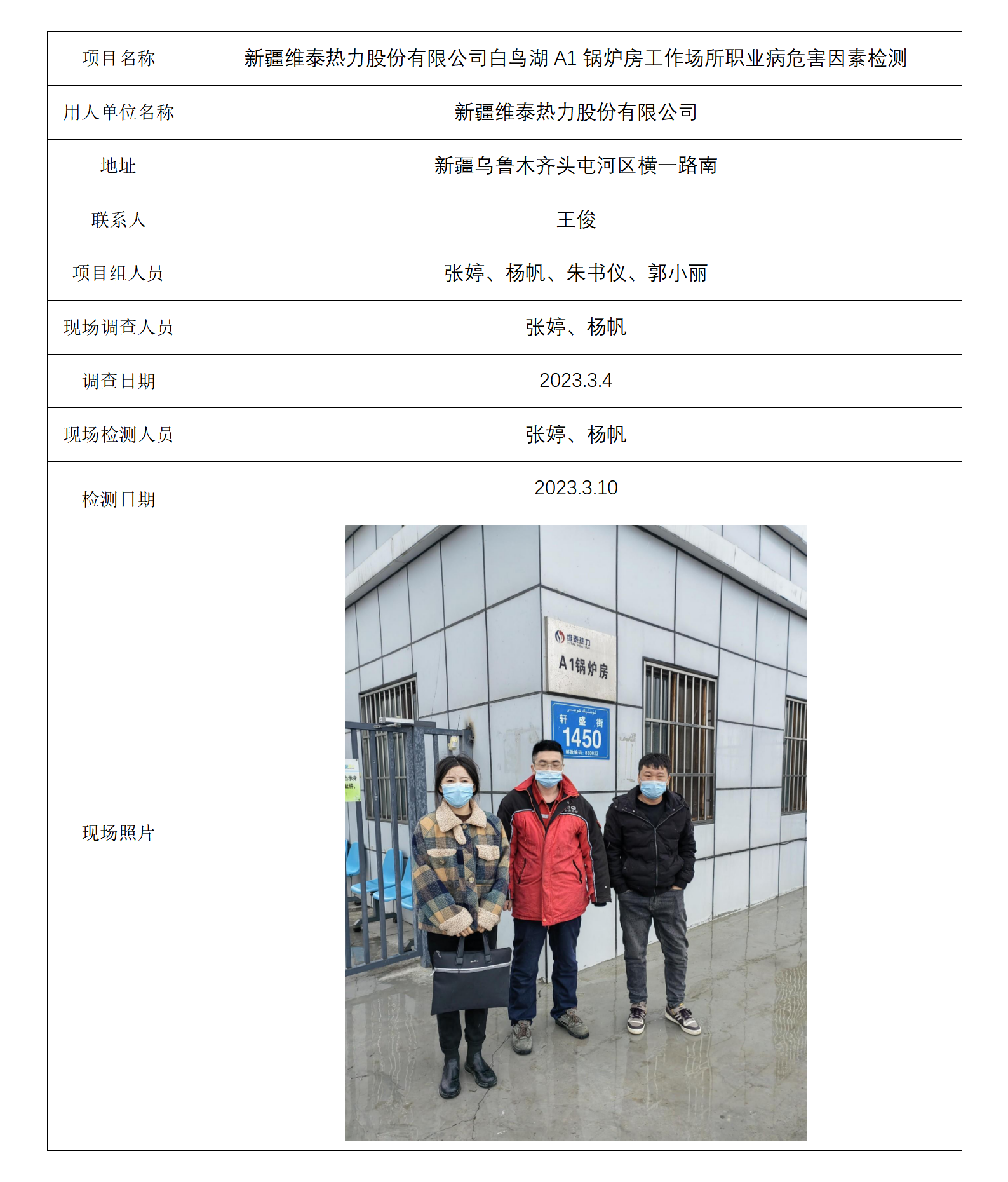 新疆维泰热力股份有限公司白鸟湖A1锅炉房工作场所职业病危害因素检测