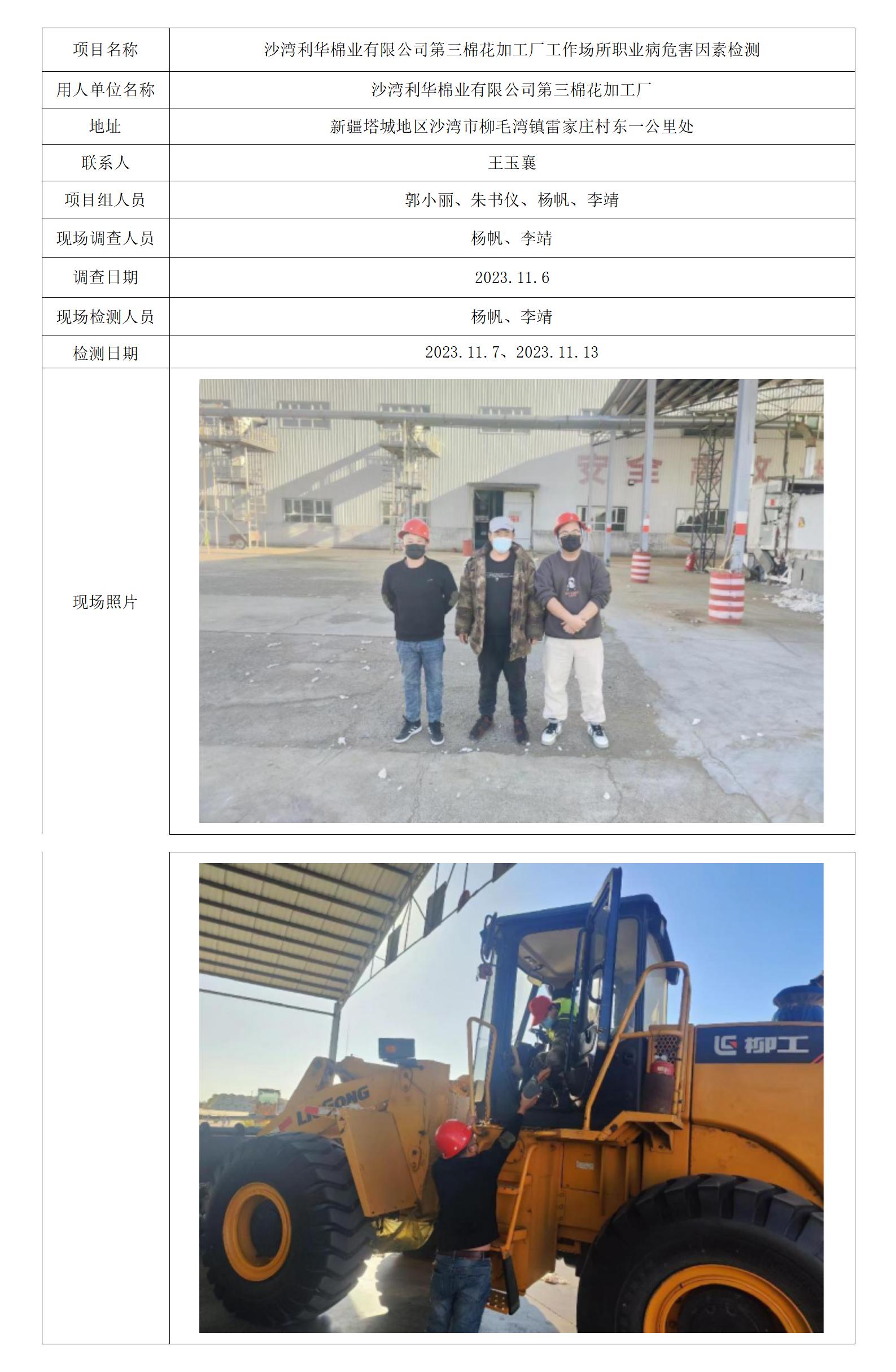 沙湾利华棉业有限公司第三棉花加工厂工作场所职业病危害因素检测