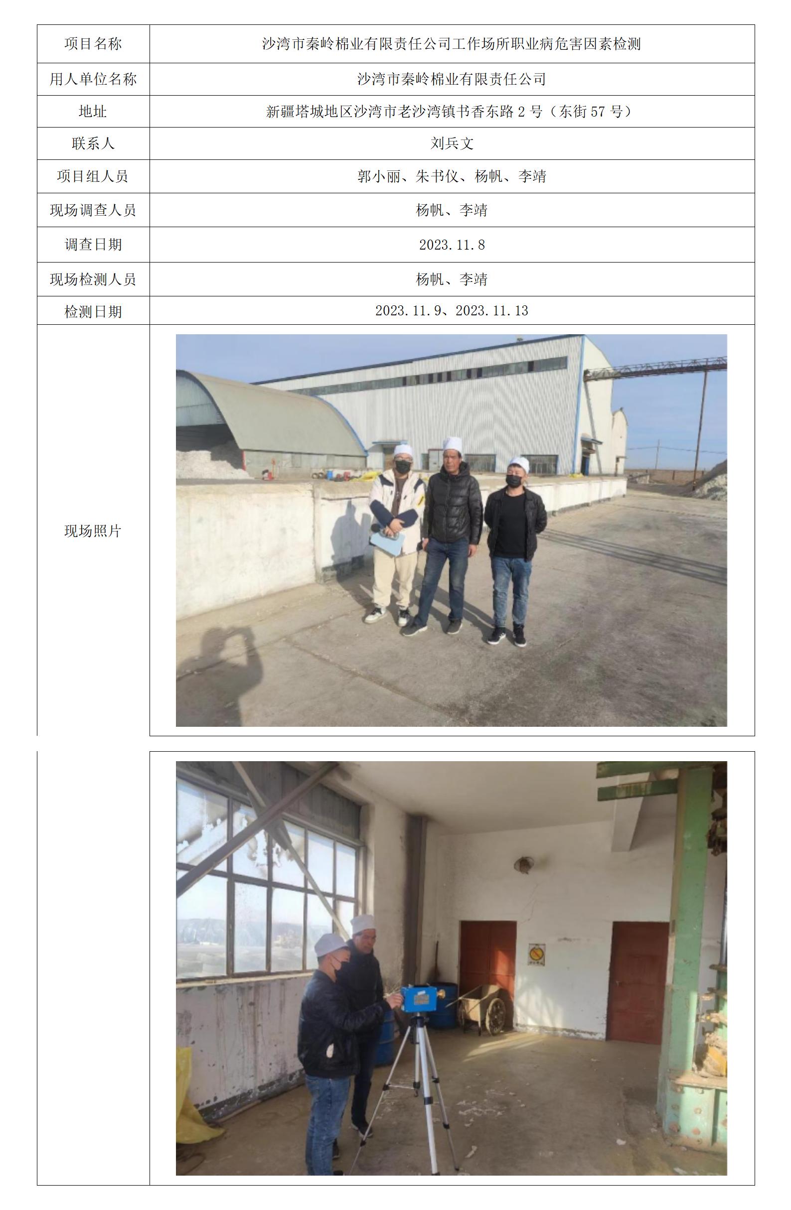 沙湾市秦岭棉业有限责任公司工作场所职业病危害因素检测