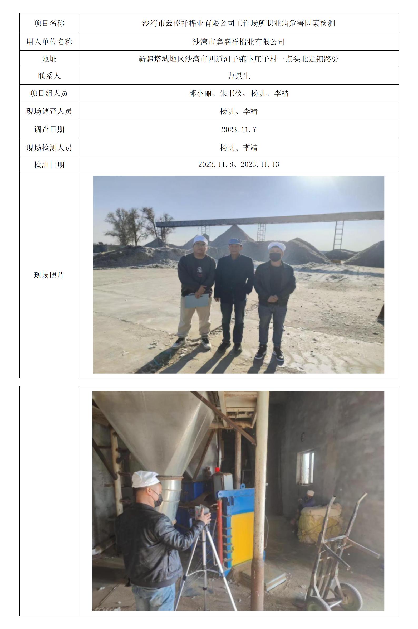 沙湾市鑫盛祥棉业有限公司工作场所职业病危害因素检测