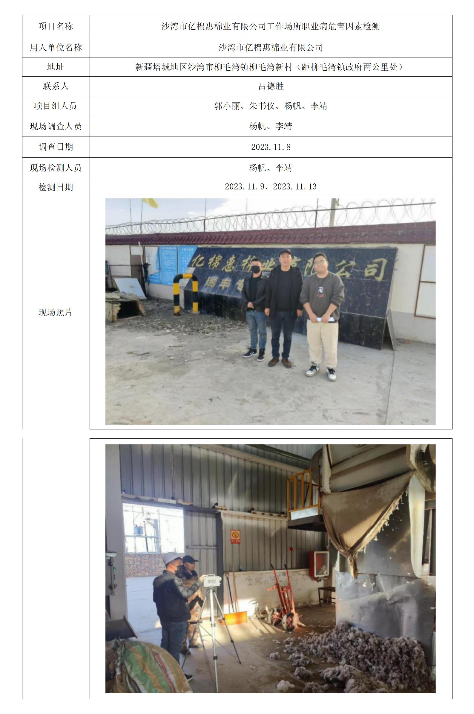 沙湾市亿棉惠棉业有限公司工作场所职业病危害因素检测