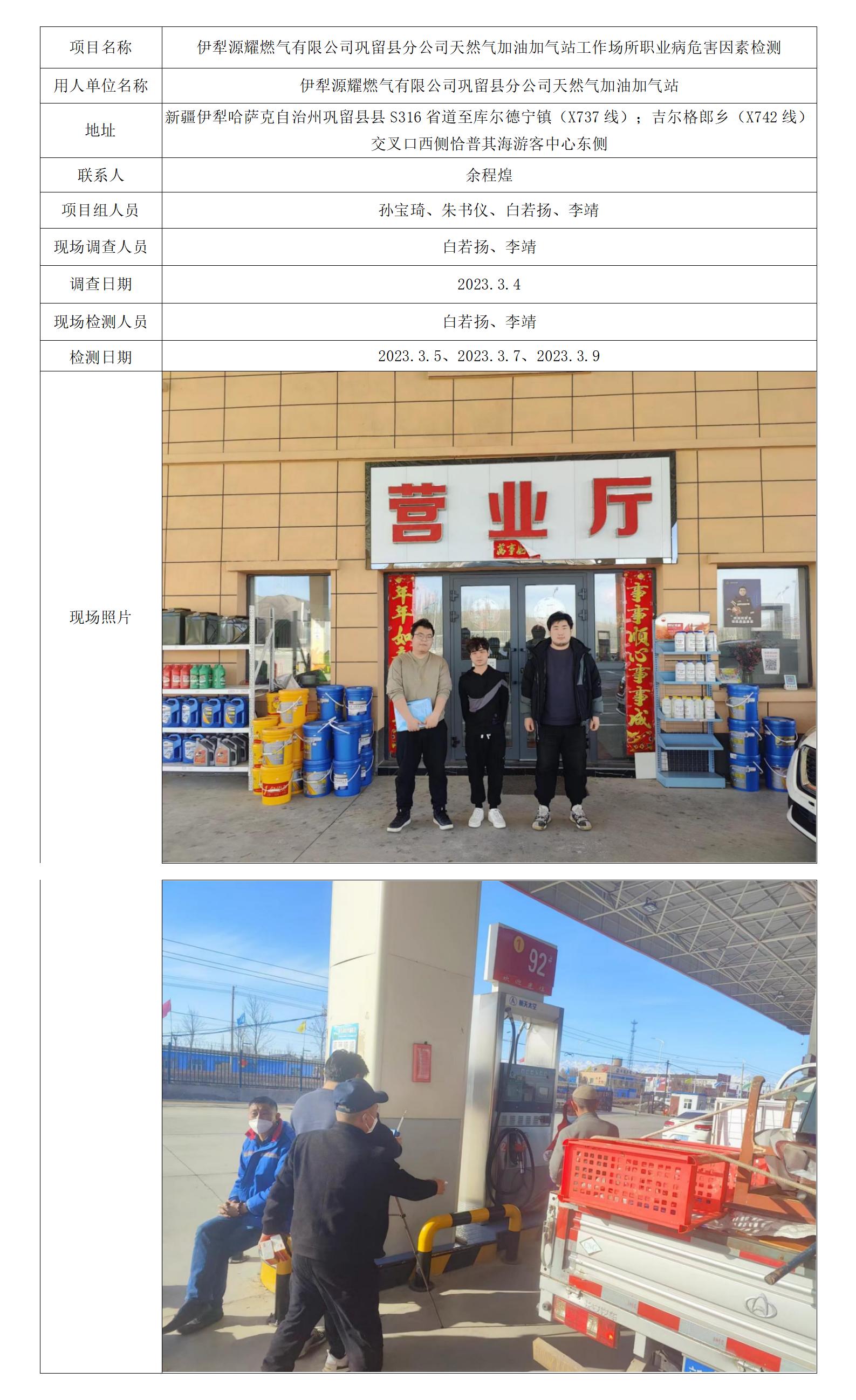 伊犁源耀燃气有限公司巩留县分公司天然气加油加气站工作场所职业病危害因素检测