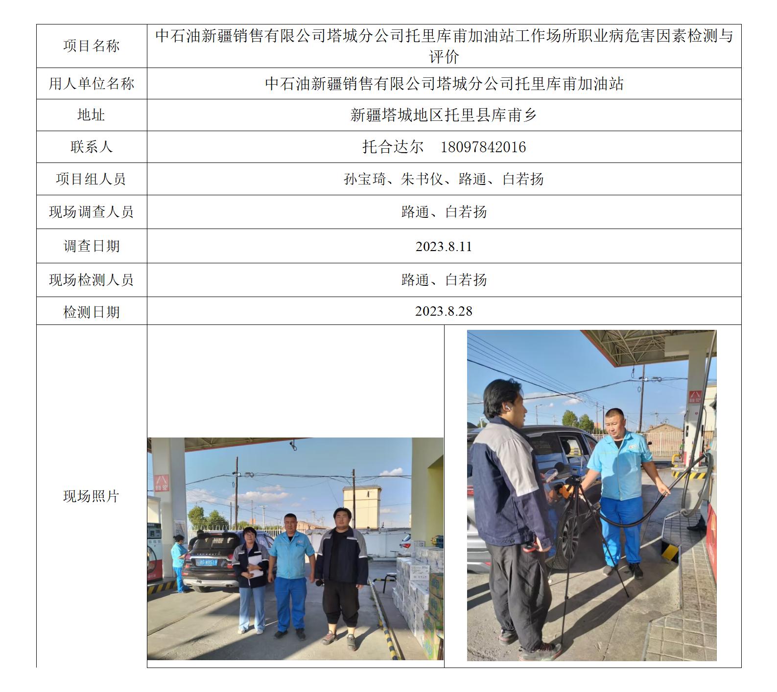 中石油新疆销售有限公司塔城分公司托里库甫加油站工作场所职业病危害因素检测与评价