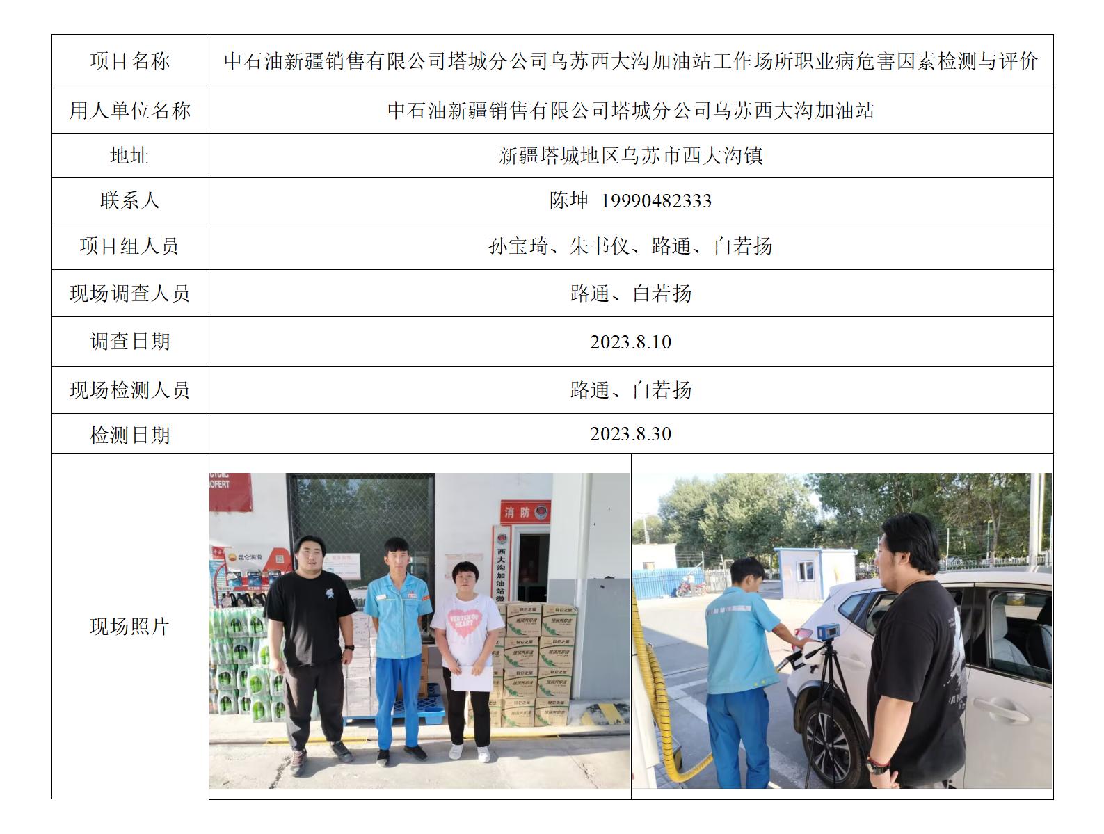 中石油新疆销售有限公司塔城分公司乌苏西大沟加油站工作场所职业病危害因素检测与评价