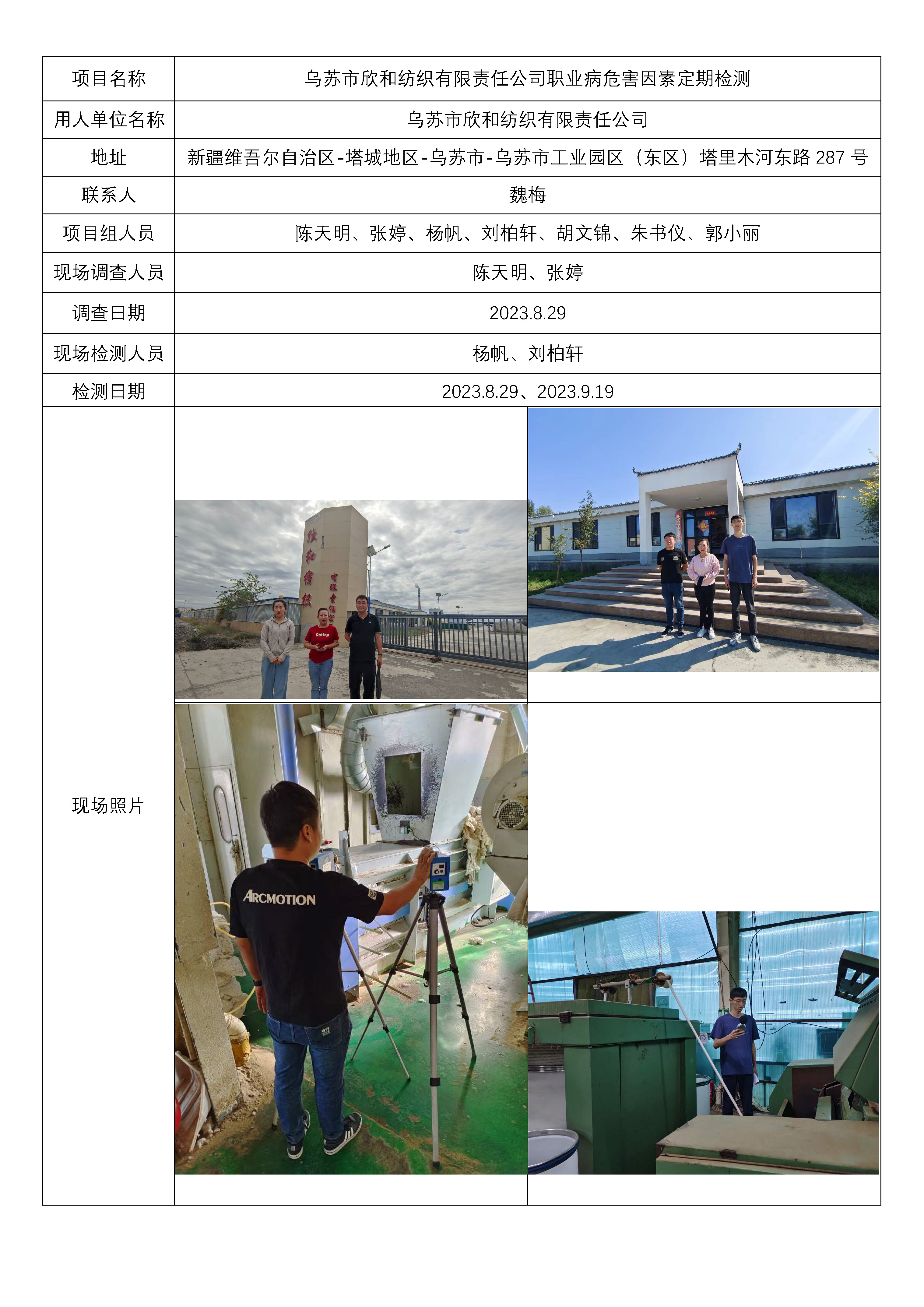 乌苏市欣和纺织有限责任公司职业病危害因素定期检测