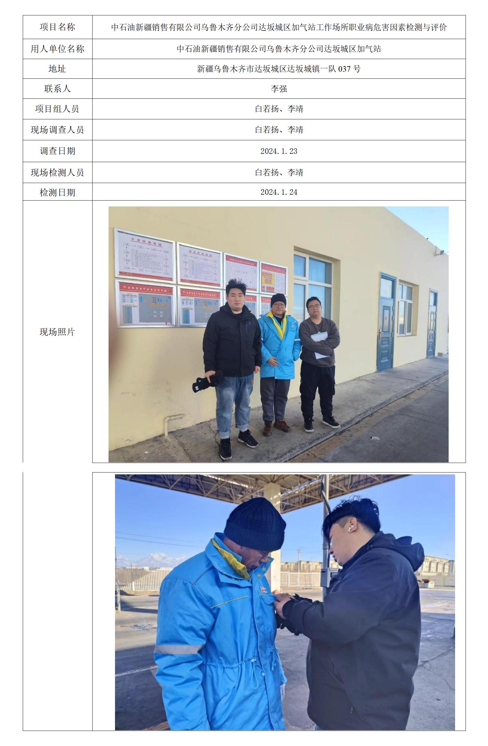 中石油新疆销售有限公司乌鲁木齐分公司达坂城区加气站工作场所职业病危害因素检测与评