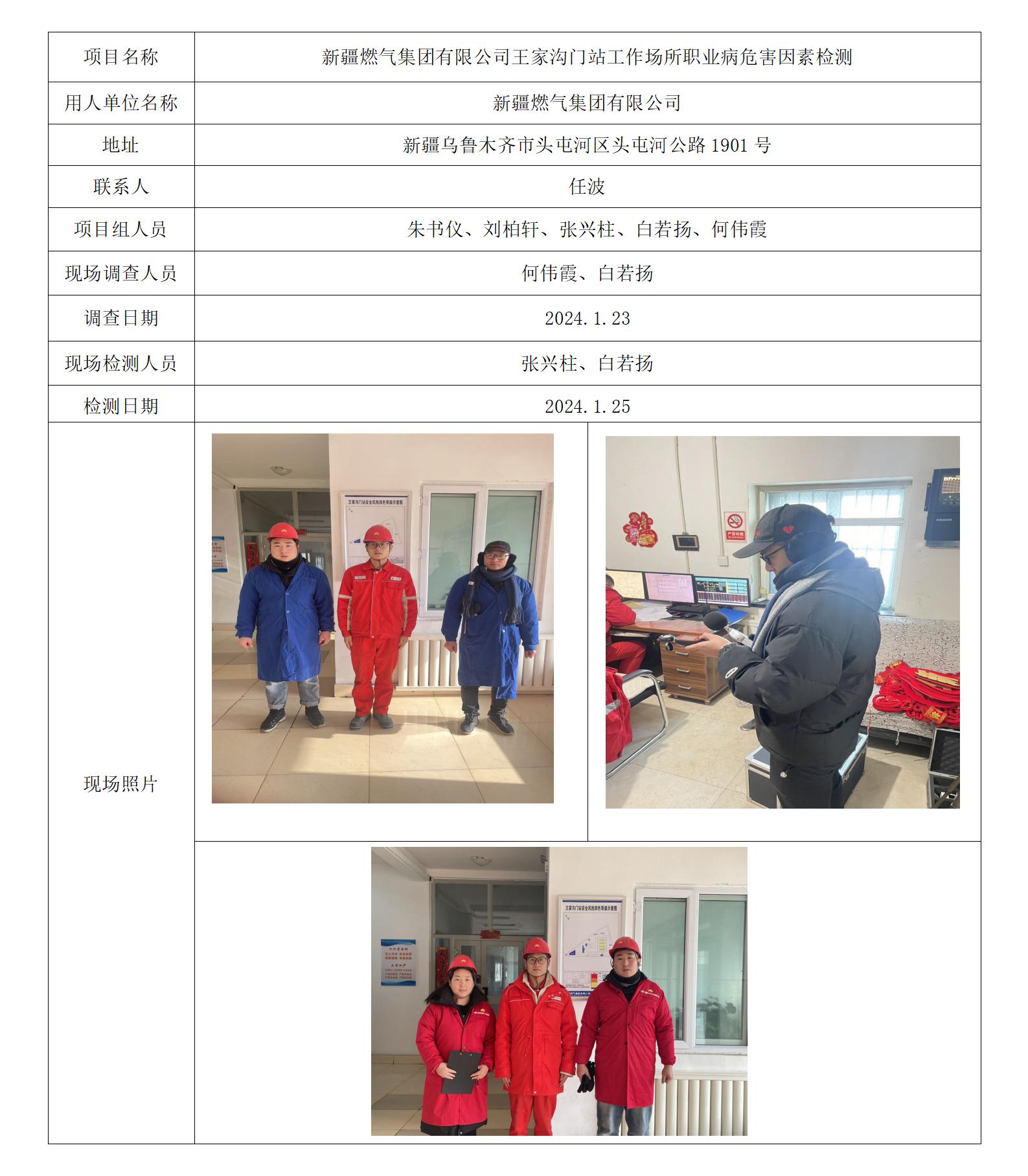 新疆燃气集团有限公司王家沟门站工作场所职业病危害因素检测