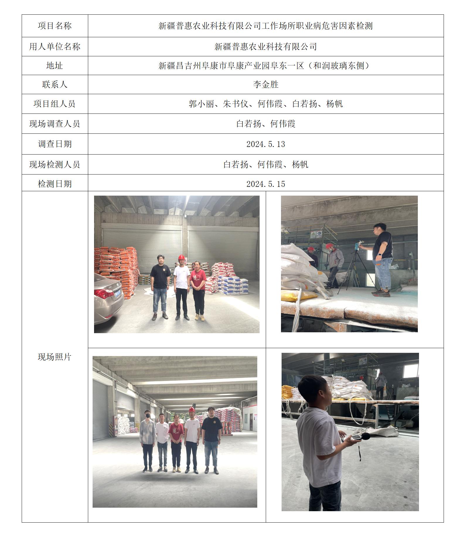 新疆普惠农业科技有限公司工作场所职业病危害因素检测
