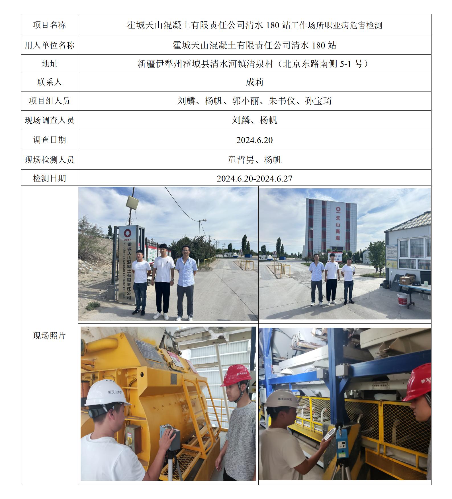 霍城天山混凝土有限责任公司清水180站工作场所职业病危害因素检测