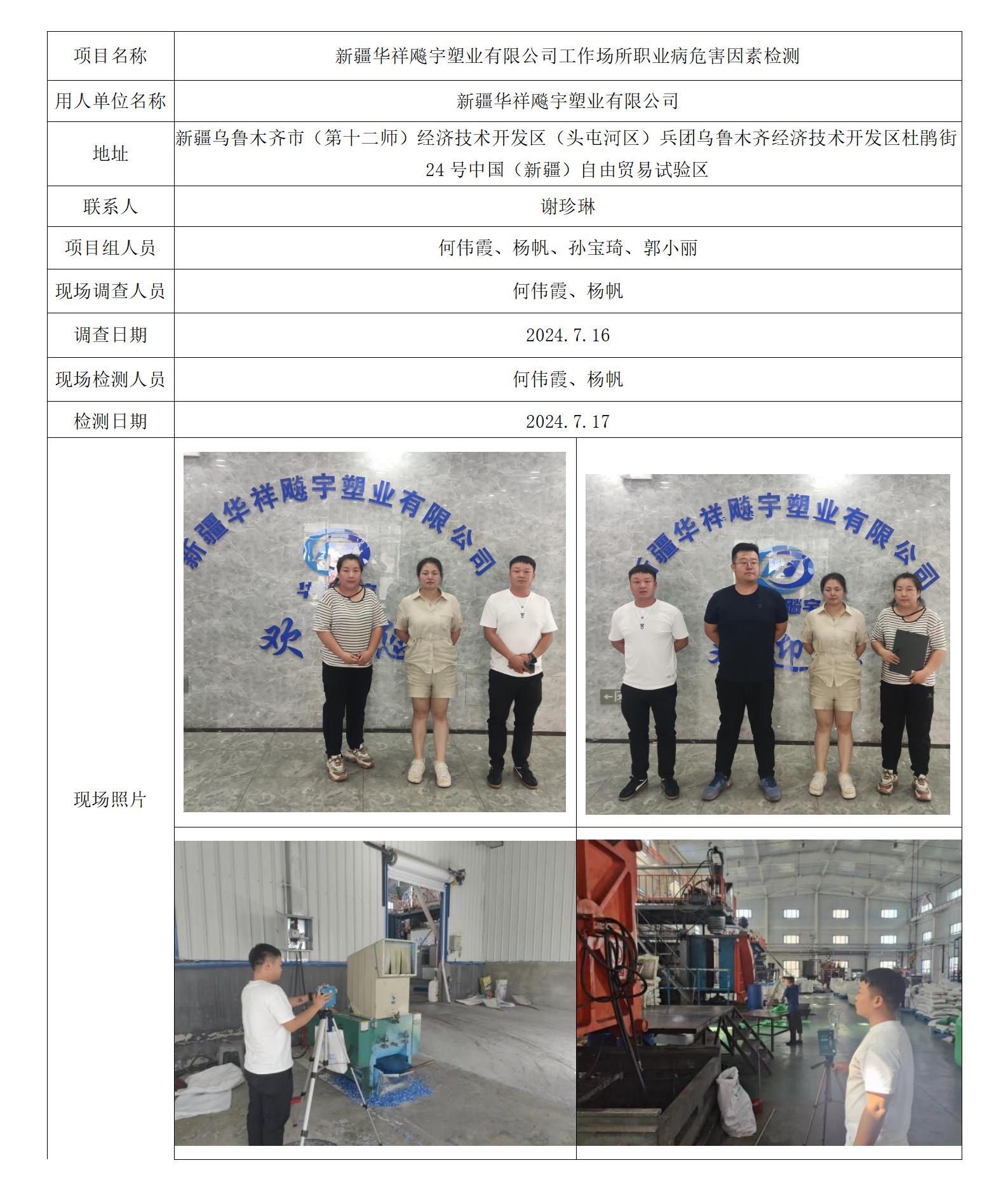新疆华祥飚宇塑业有限公司工作场所职业病危害因素检测