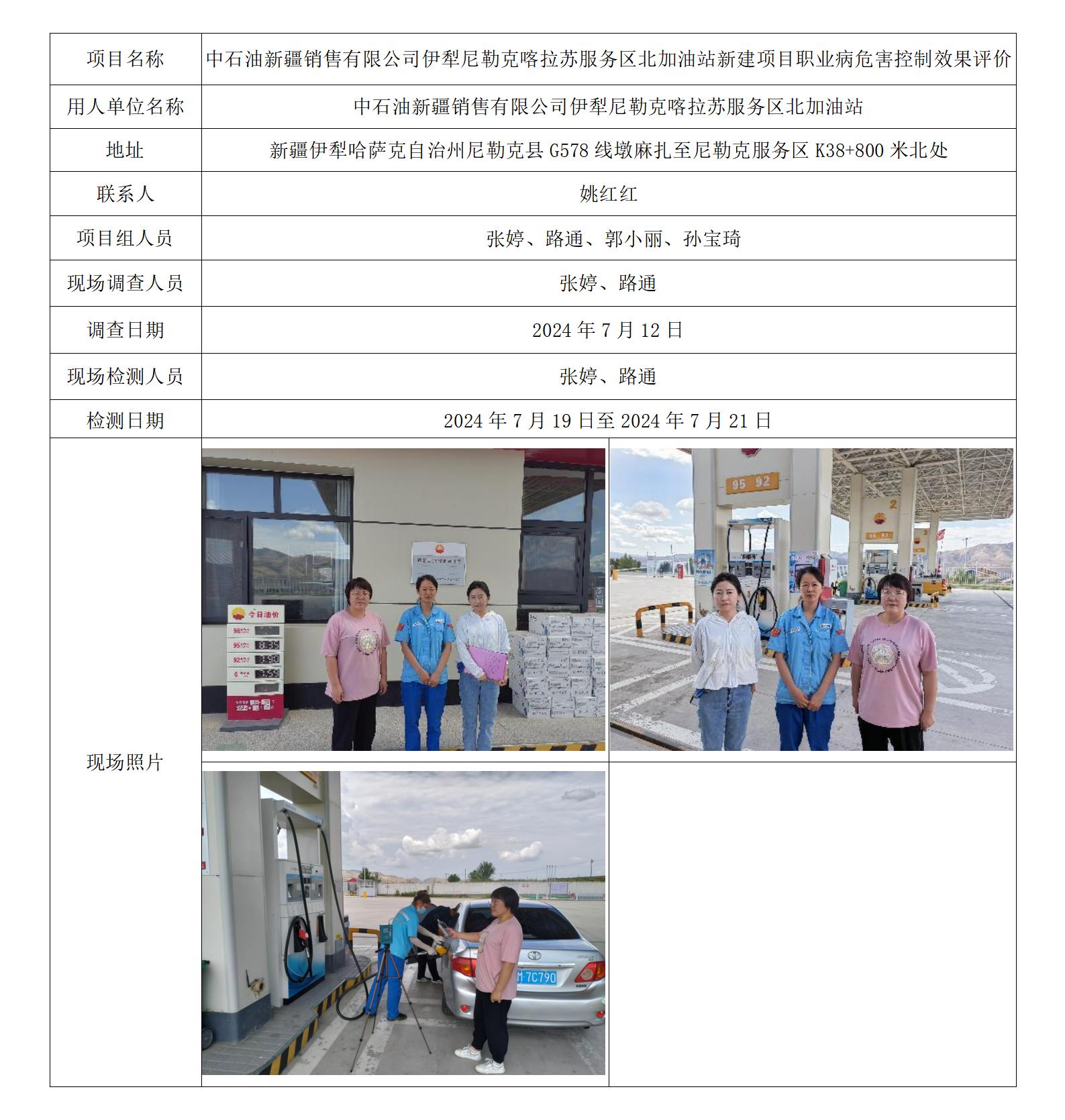 中石油新疆销售有限公司伊犁尼勒克喀拉苏北加油站新建项目职业病危害控制效果评价