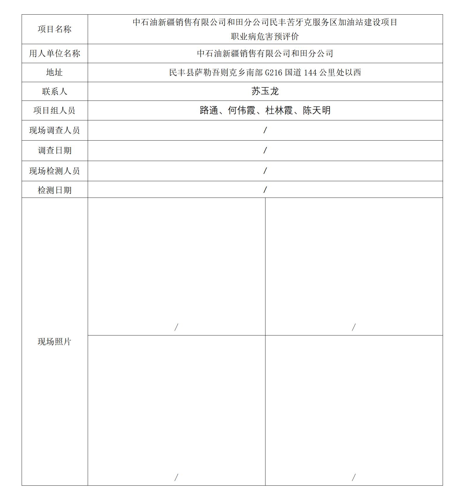 中石油新疆销售有限公司和田分公司民丰苦牙克服务区加油站建设项目职业病危害预评价