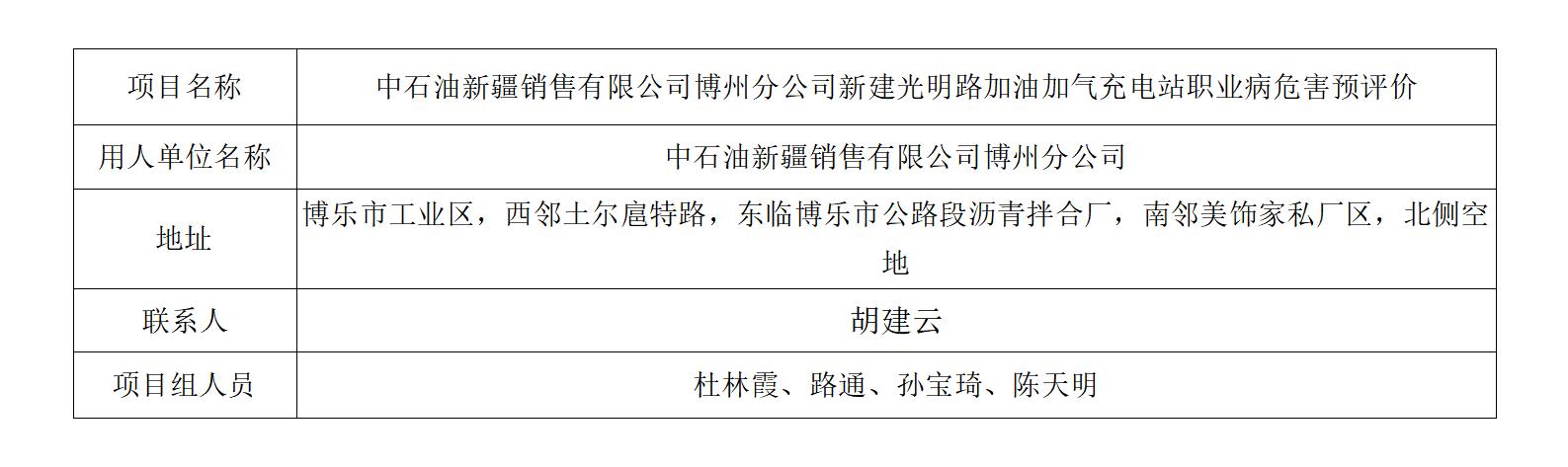 中石油新疆销售有限公司博州分公司新建光明路加油加气充电站职业病危害预评价