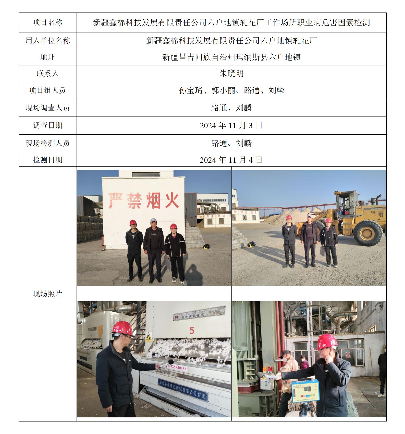 新疆鑫棉科技发展有限责任公司六户地镇札花厂工作场所职业病危害因素检测