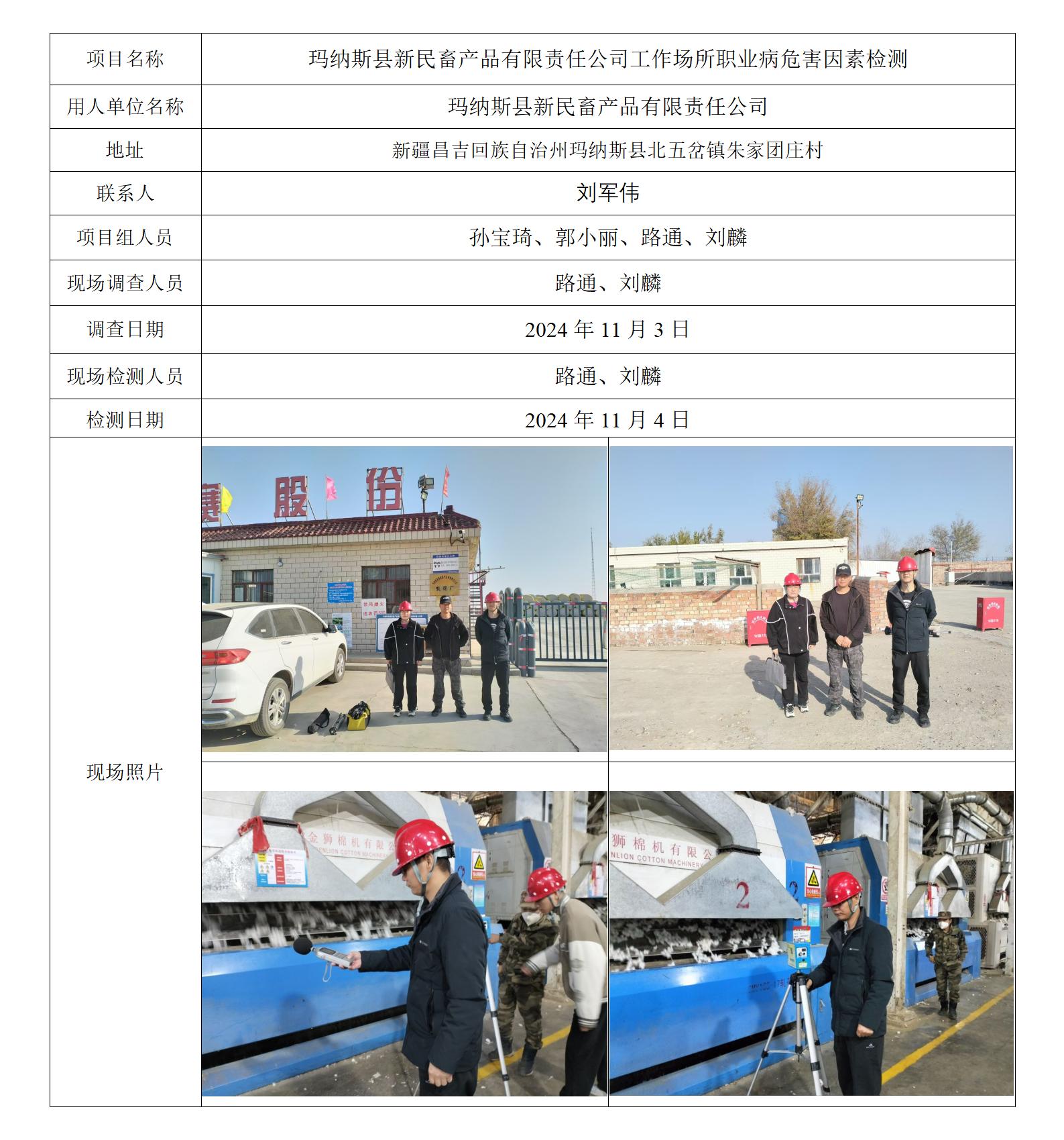 玛纳斯县新民畜产品有限责任公司工作场所职业病危害因素检测
