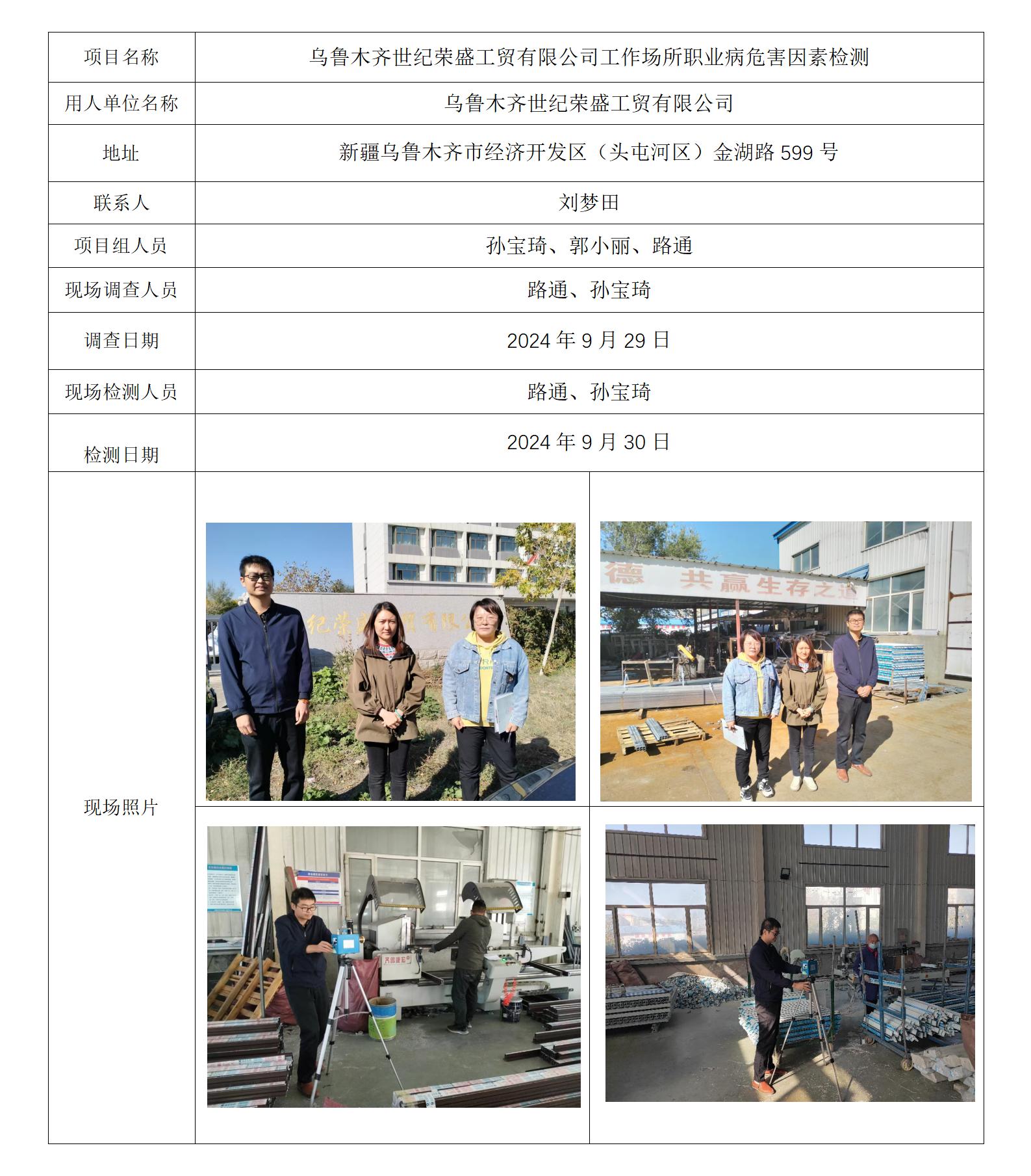 乌鲁木齐世纪荣盛工贸有限公司工作场所职业病危害因素检测