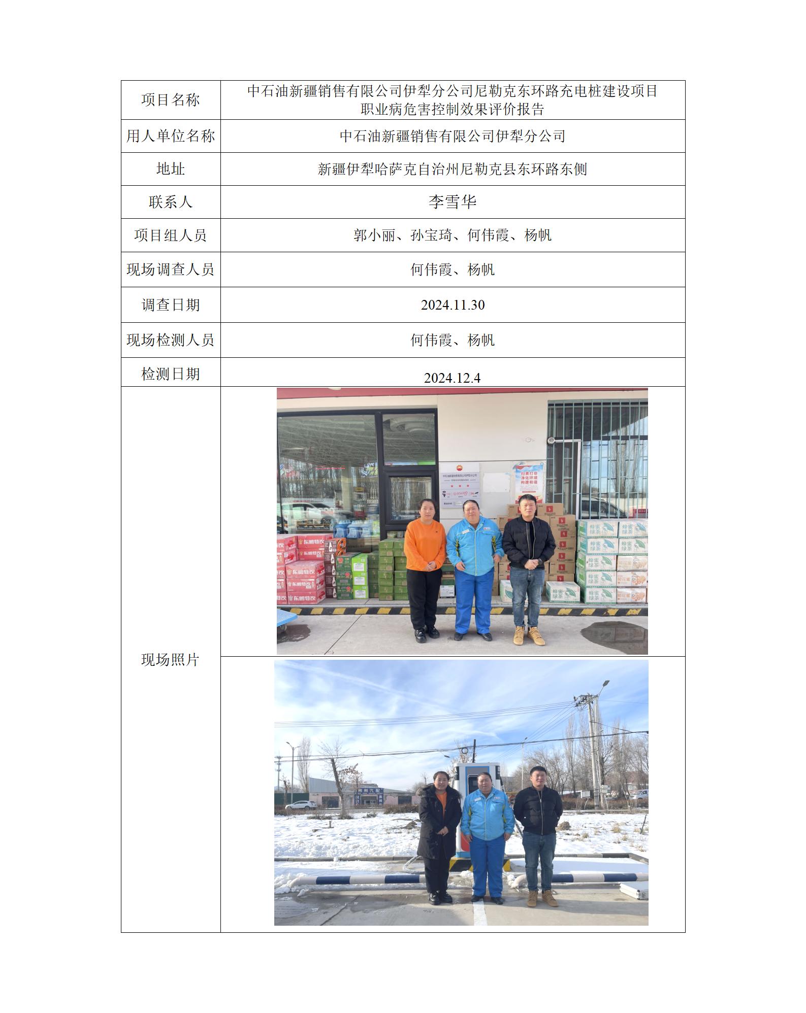 中石油新疆销售有限公司伊犁分公司尼勒克东环路充电桩建设项目职业病危害控制效果评价 2024-12-31 11:36:41