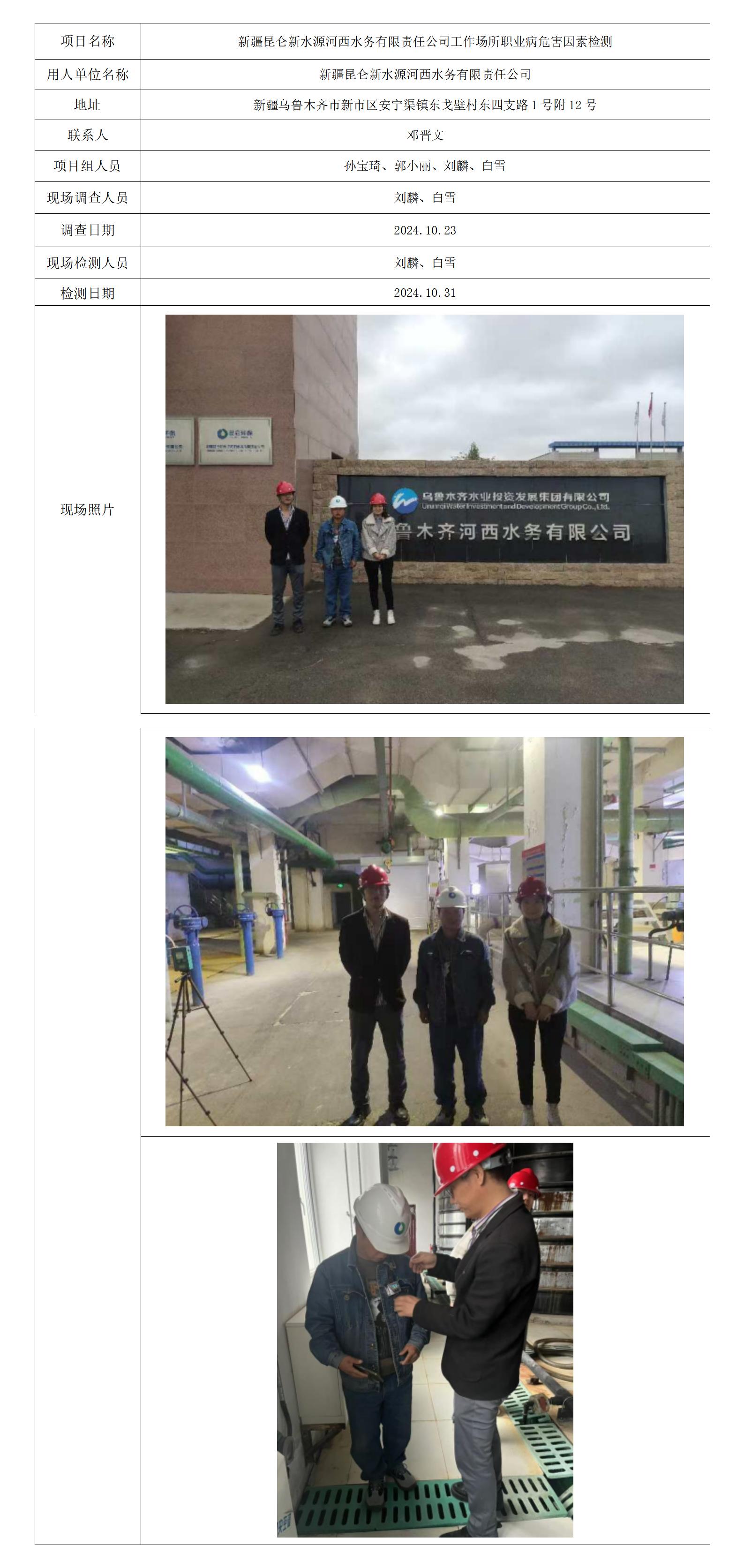 新疆昆仑新水源河西水务有限责任公司工作场所职业病危害因素检测
