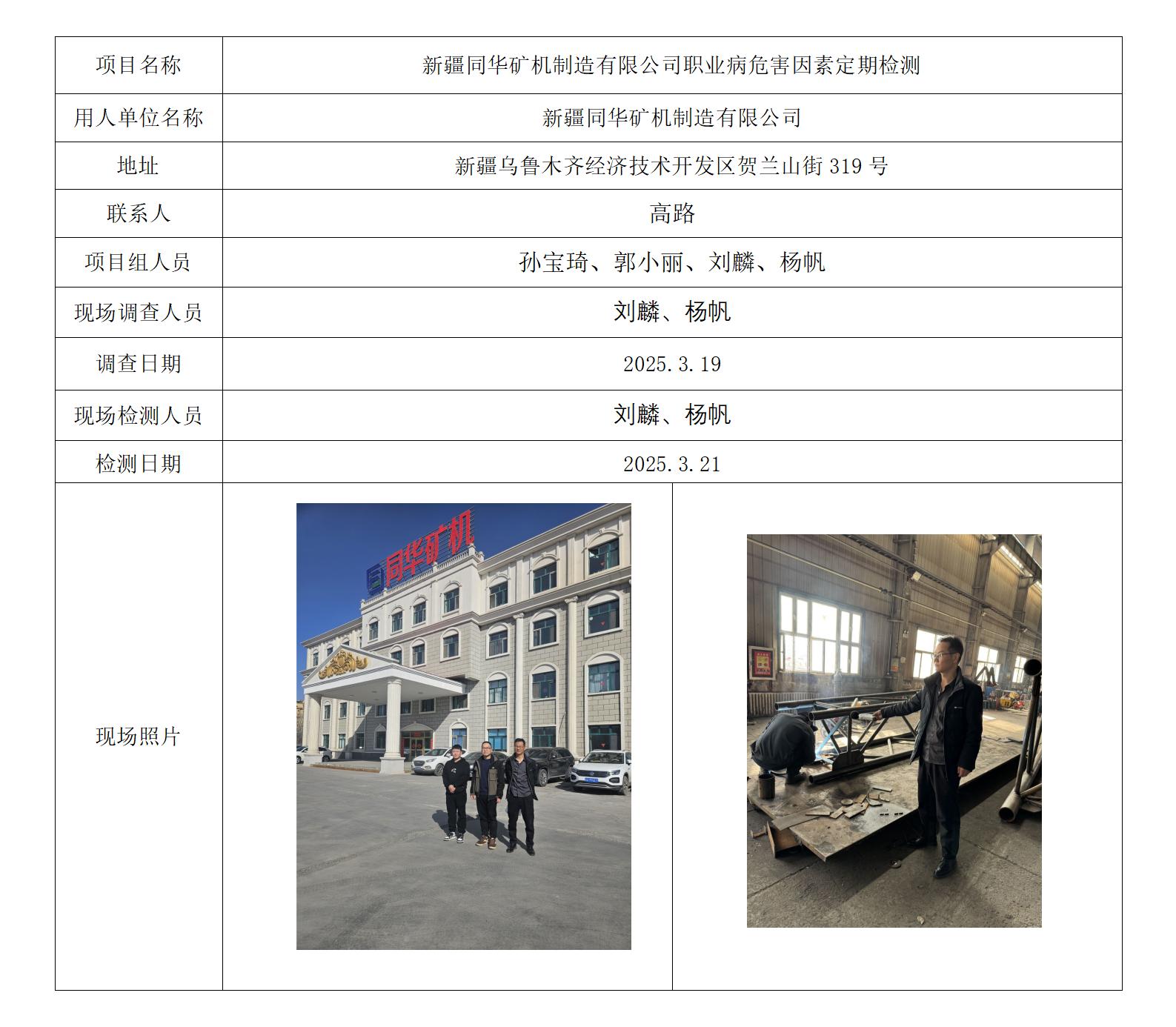 新疆同华矿机制造有限公司工作场所职业病危害因素检测