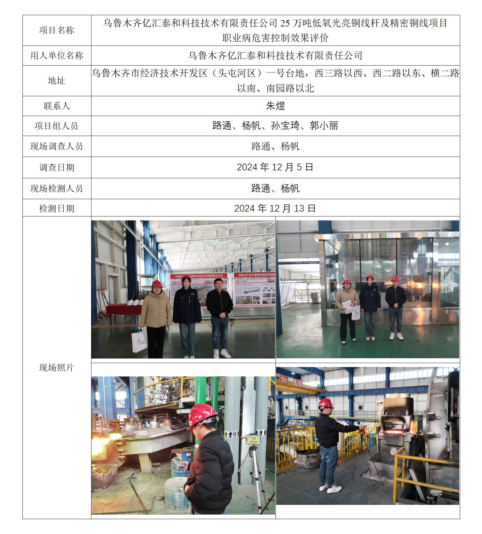 乌鲁木齐亿汇泰和科技技术有限责任公司25万吨低氧光亮铜线杆及精密铜线项目职业病危害控制效果评价 2025-04-10 17:49:36