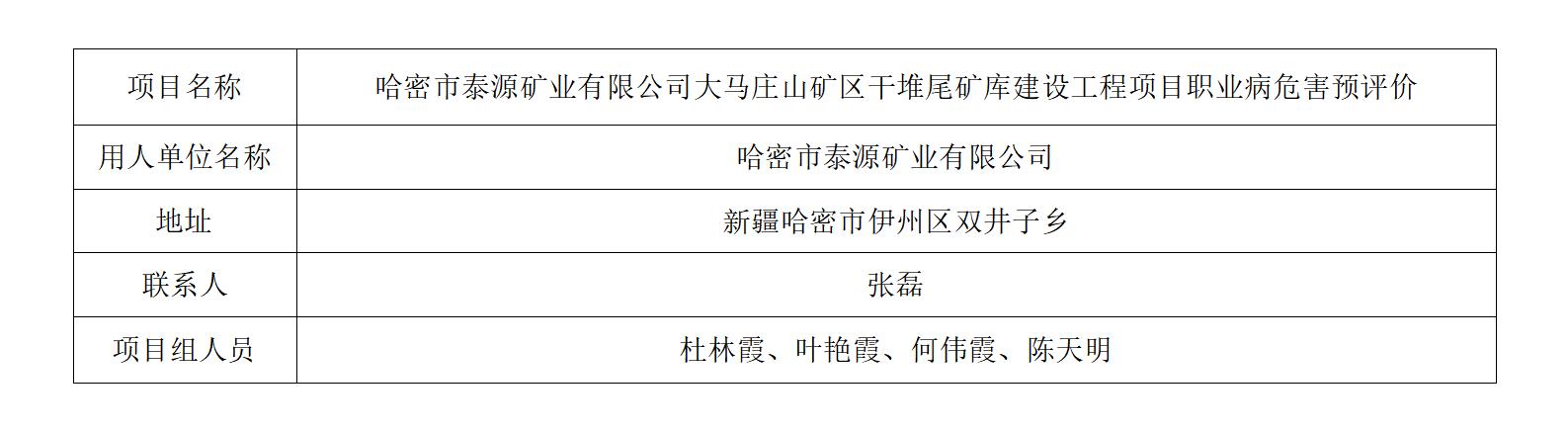 哈密市泰源矿业有限公司大马庄山矿区干堆尾矿库建设工程项目职业病危害预评价