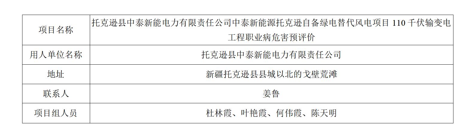 托克逊县中泰新能电力有限责任公司中泰新能源托克逊自备绿电替代风电项目110千伏输变电工程职业病危害预评价