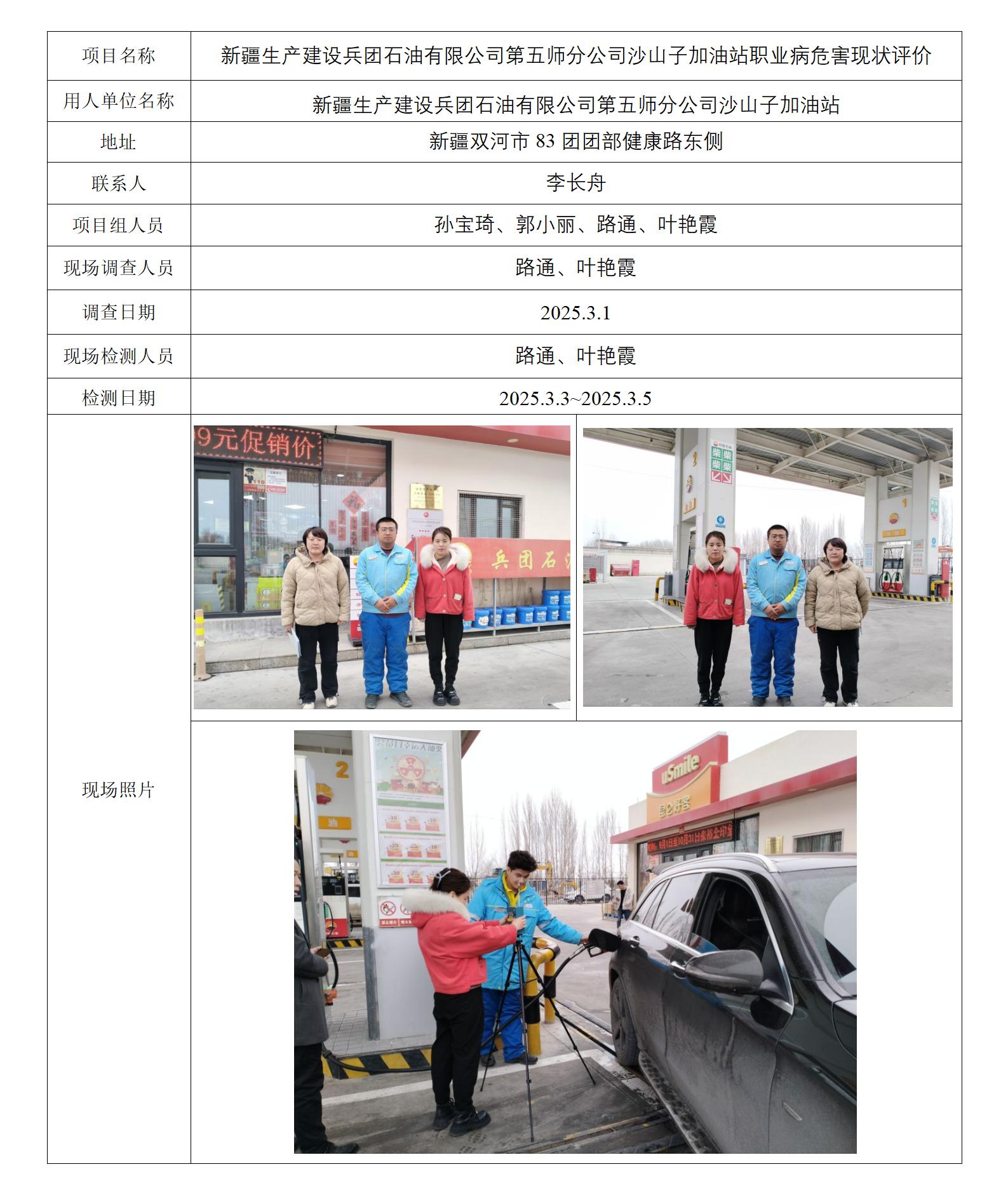 新疆生产建设兵团石油有限公司第五师分公司沙子山加油站职业病危害现状评价