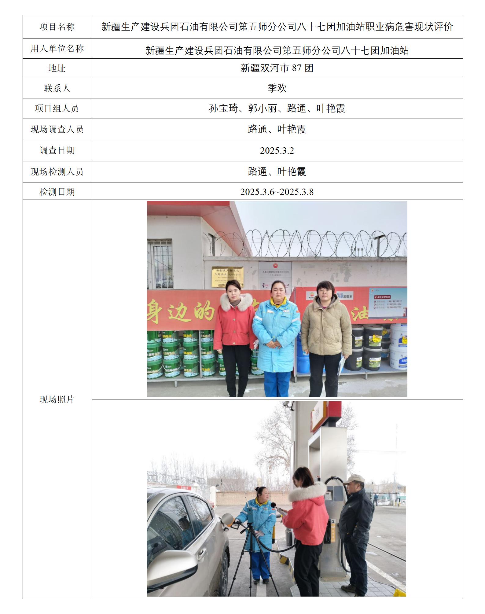 新疆生产建设兵团石油有限公司第五师分公司八十七团加油站职业病危害现状评价