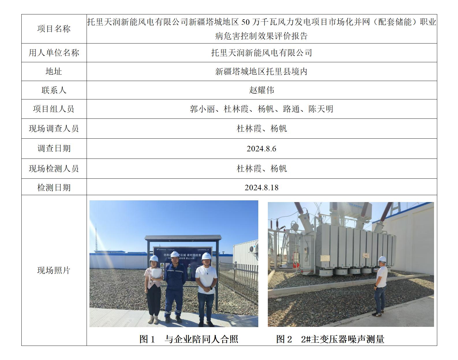 托里天润新能风电有限公司新疆塔城地区50万千瓦风力发电项目市场化并网(配套储能)职业病危害控制效果评价 2024-08-23 15:32:50