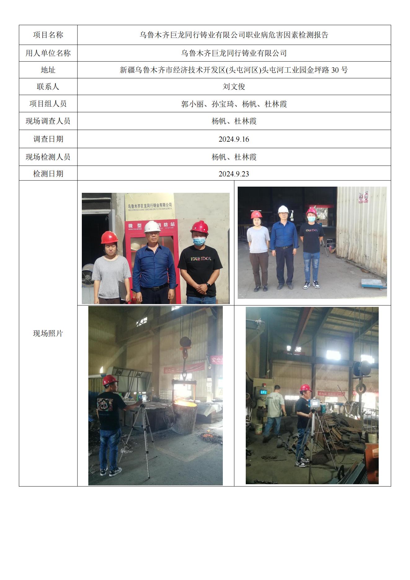 乌鲁木齐巨龙同行铸业有限公司职业病危害因素检测报告