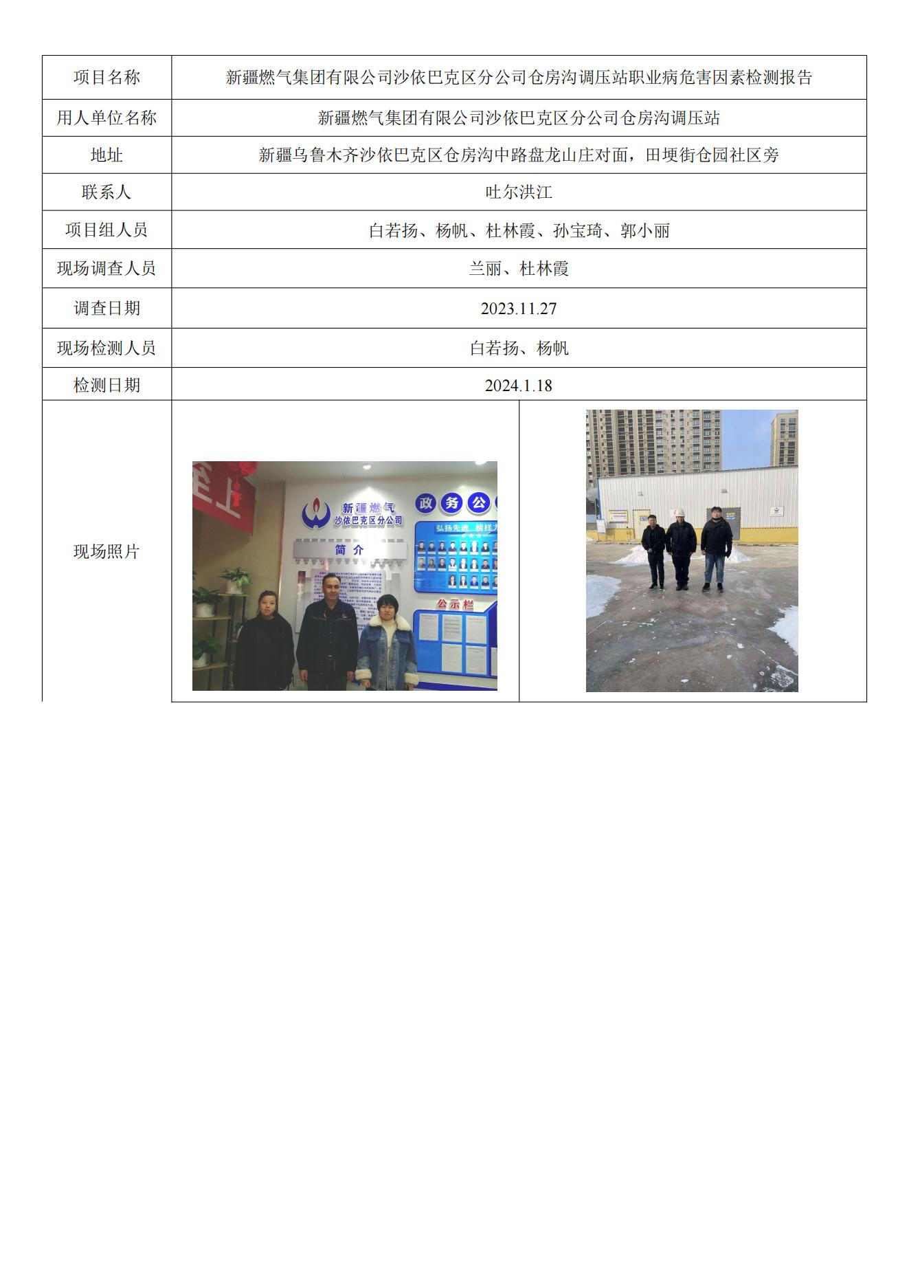 新疆燃气集团有限公司沙依巴克区分公司仓房沟调压站职业病危害因素检测报告