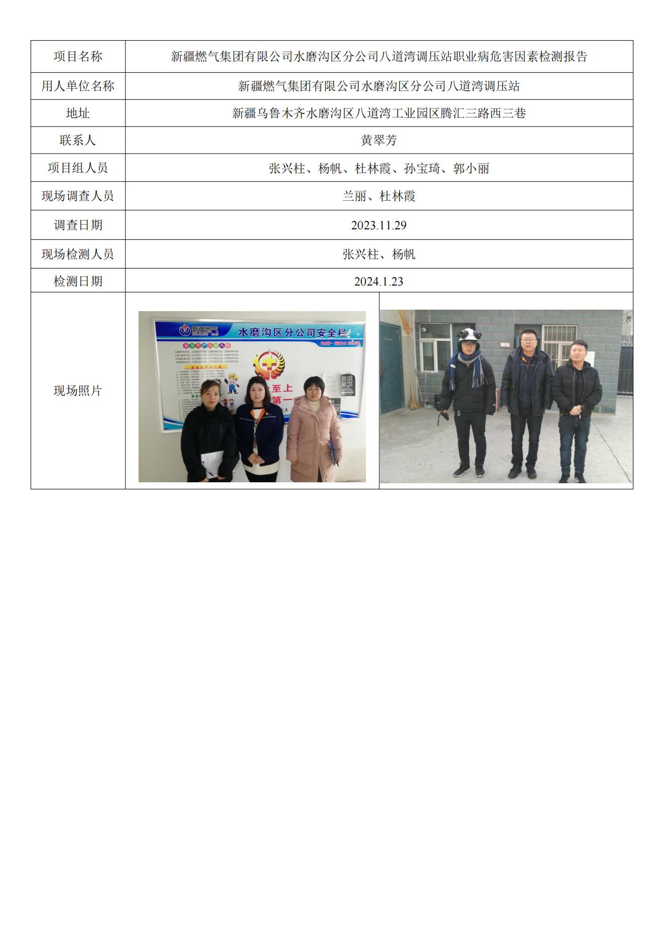 新疆燃气集团有限公司水磨沟区分公司八道湾调压站职业病危害因素检测报告