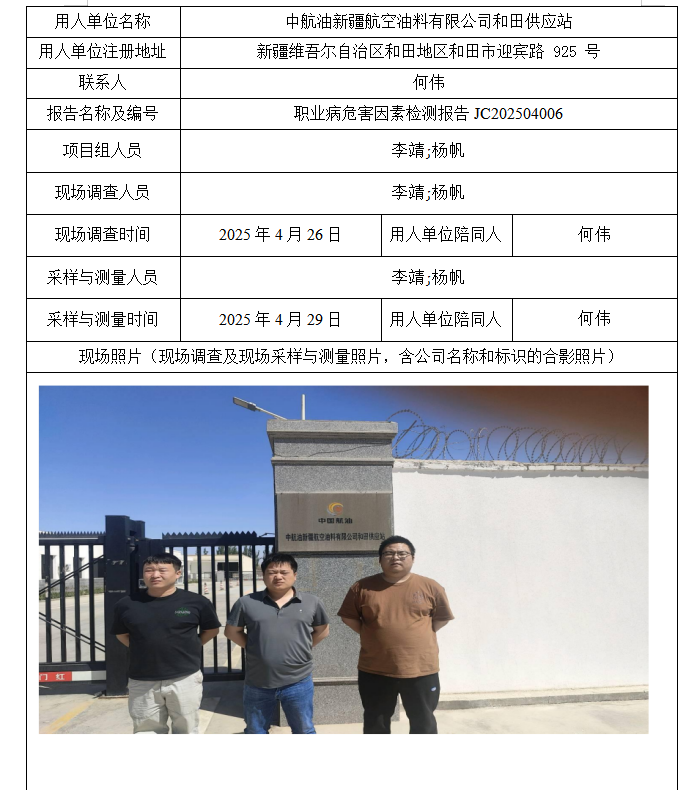 中航油新疆航空油料有限公司和田供应站职业病危害定期检测