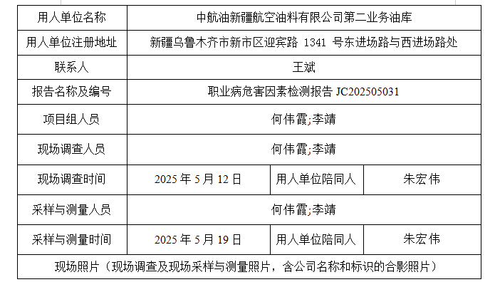 中航油新疆航空油料有限公司第二业务油库职业病危害定期检测