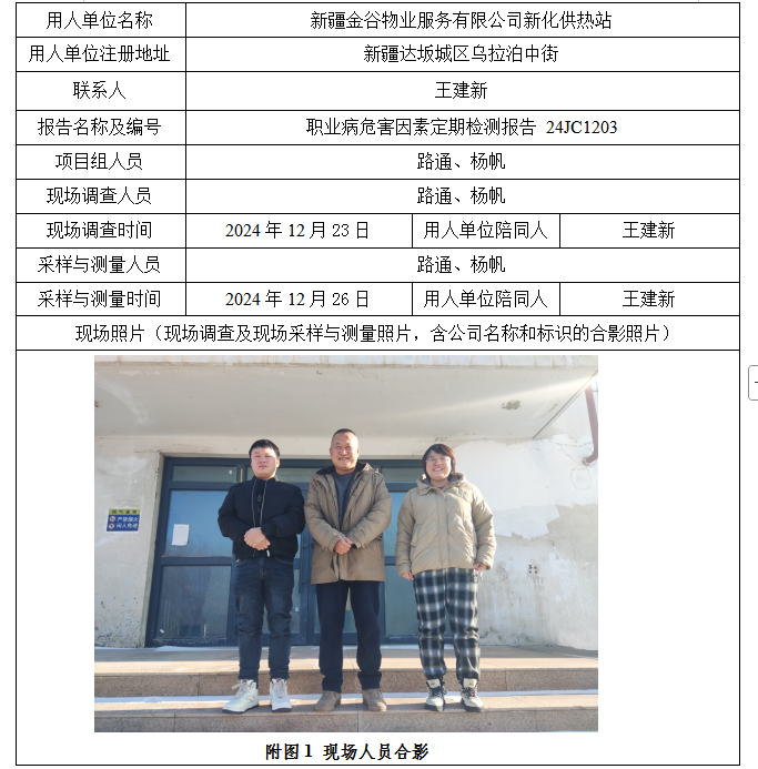 新疆金谷物业服务有限公司新化供热站工作场所职业病危害因素定期检测