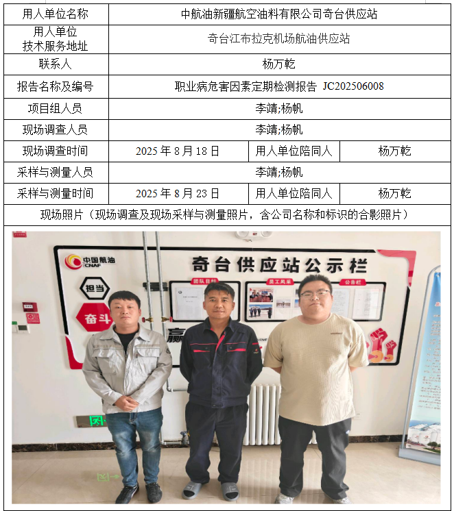 中航油新疆航空油料有限公司奇台供应站职业病危害因素定期检测