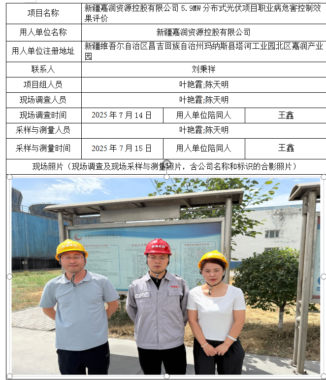 新疆嘉润资源控股有限公司5.9MW分布式光伏项目职业病危害控制效果评价