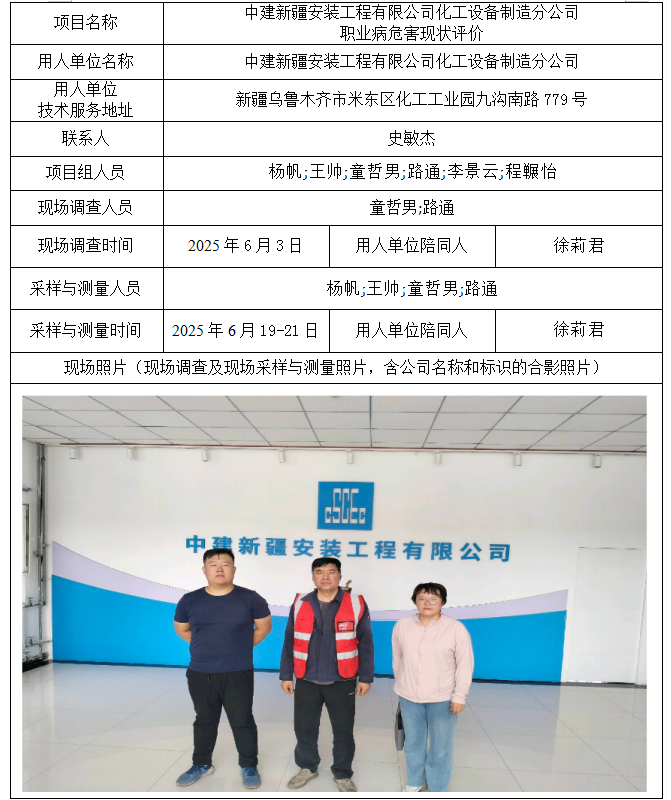 中建新疆安装工程有限公司化工设备制造分公司工作场所职业病危害现状评价