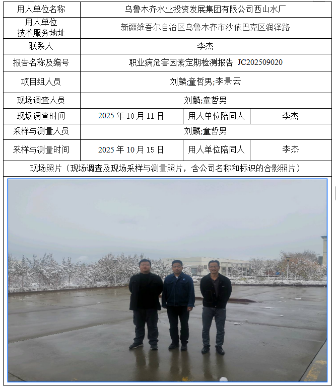 乌鲁木齐水业投资发展集团有限公司西山水厂职业病危害因素定期检测